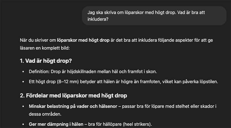 Bilden ovan visar ett exempel där jag ber ChatGPT ge mig förslag på saker att skriva om till ämnet ”löparskor med högt drop”. Här kan de bästa förslagen plockas ut och skrivas om manuellt.