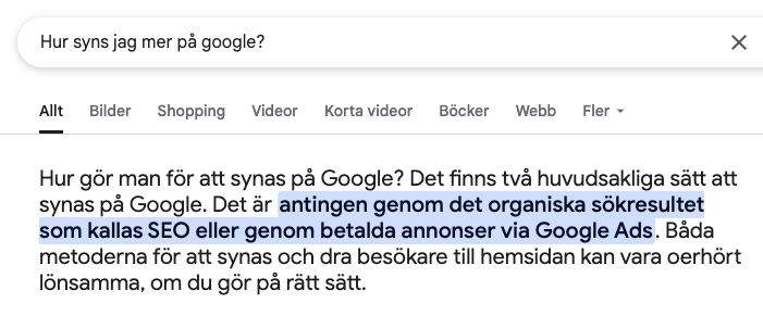 Featured Snippet lyfter alltså upp en källa medan AI Overview fungerar mer som en miniartikel skriven av AI, baserad på innehåll från flera webbplatser. Här är ett exempel på Featured Snippet: